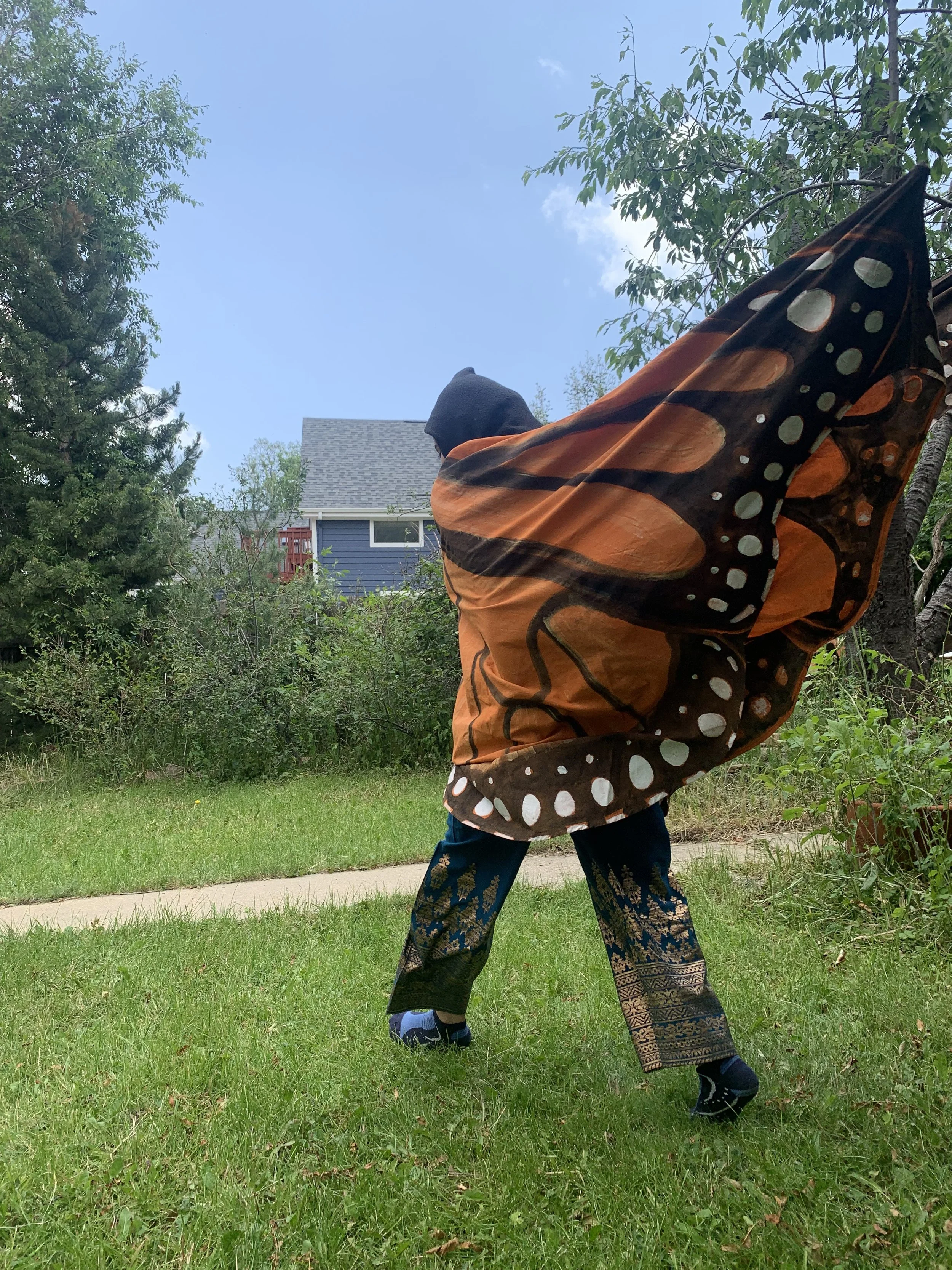“This was a weird, quirky, serene experience. It was a lovely reminder to not lose those parts of myself while striving for transformational change. At one point one of my wings “broke” and yet I continued moving gracefully, and I thought of it as a metaphor for when something goes wrong/ if you’re feeling down, that you’re still able to keep going!”